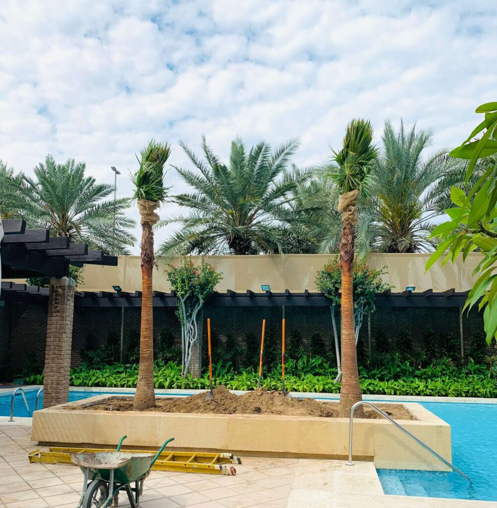 Proscape FM LLC installing date palm and Washingtonia palm trees for White Star General Trading LLC in UAE – expert palm planting and landscaping servic